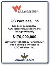 LGC Wireless is a leading supplier of global wireless networking solutions. The company's products enable high-speed wireless voice and data communications in dense urban areas as well as inside public and private structures. LGC ships its products to customers in over 30 countries and supports all major wireless access standards, including TDMA, CDMA, GSM, iDEN, 1xRTT, Ev-DO, GPRS, W-CDMA, UMTS and 802.11.