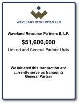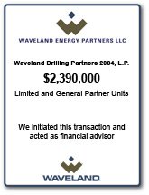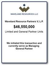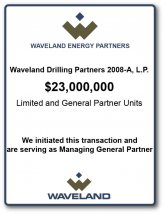 Over the past 20 years, Waveland Energy Partners has sponsored or served as managing general partner for more than 40 energy programs. Waveland has been active in the Mid-Continent region in Oklahoma since 2002, the Permian Basin in Texas since 2012, the San Juan Basin in New Mexico since 2016, and the Williston Basin since 2018. We invest alongside many of the largest and most active E&P companies in North America. Please view the below tombstones of Waveland’s portfolio of investment activities.