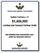 Buffalo Partners, L.P. was sponsored by Waveland Energy Partners LLC with the primary objective being the creation of income through the production and sale of oil and natural gas located on an exploration prospect located in Leon County, Texas. The partnership was funded in May 2004, and sold 100% of its assets in a transaction that closed in November 2005, realizing a 270.7% pre-tax return of investors capital, including prior distributions from operations.